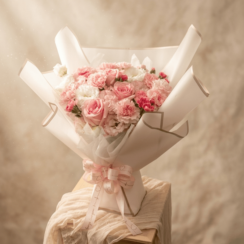 將歲月裡最溫柔的絮語,摺疊進這片純淨的粉色花海中。玫瑰的嬌柔與康乃馨的溫婉層層交織,宛如一首靜謐的詩,在每一次微風拂過時,輕輕訴說著對您無盡的感謝與繾綣的愛意。
